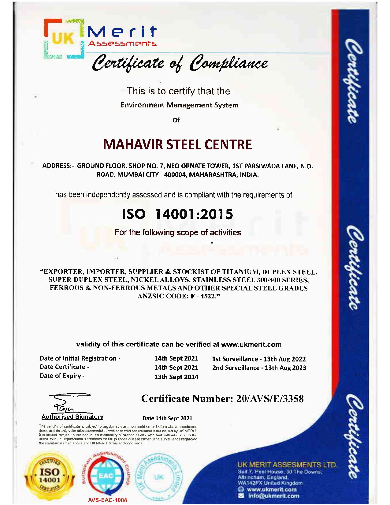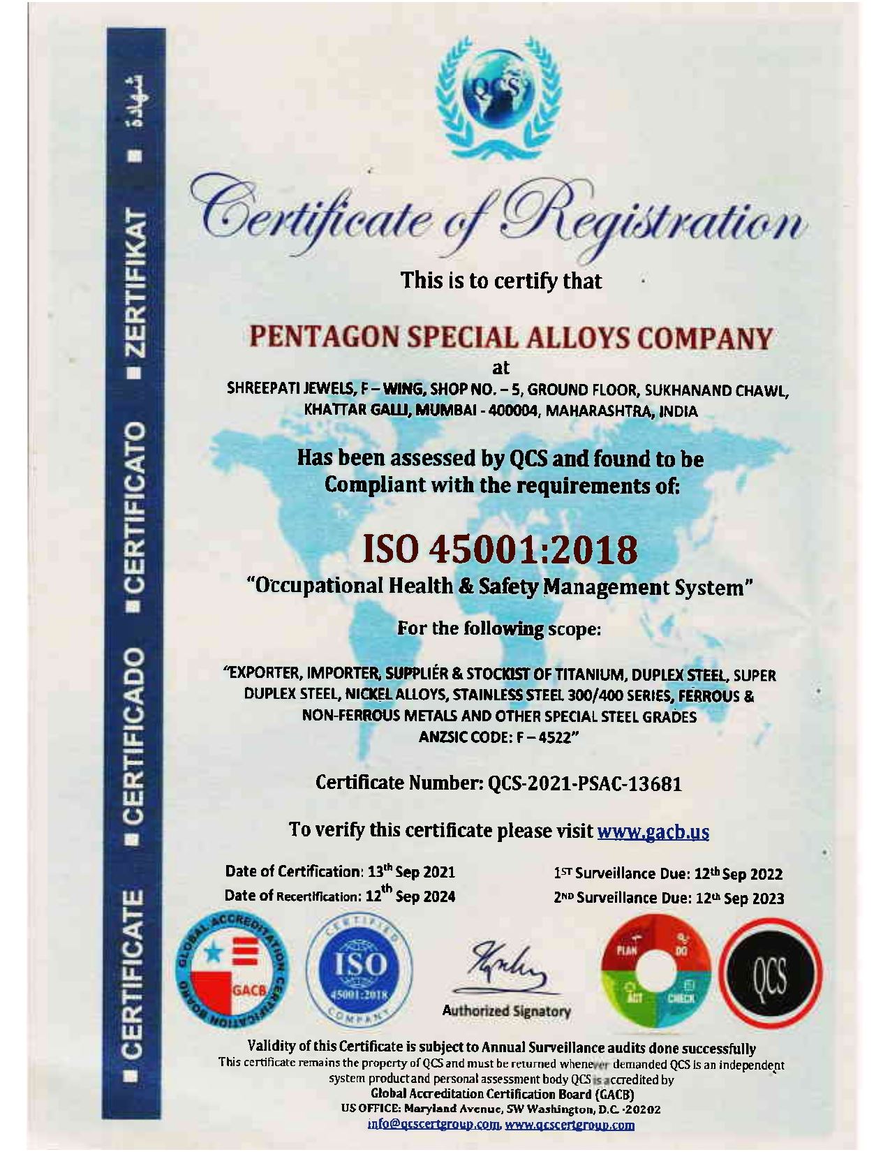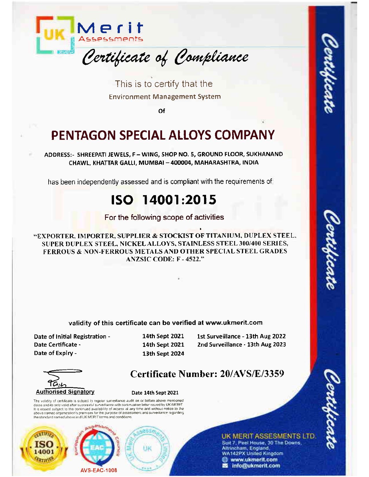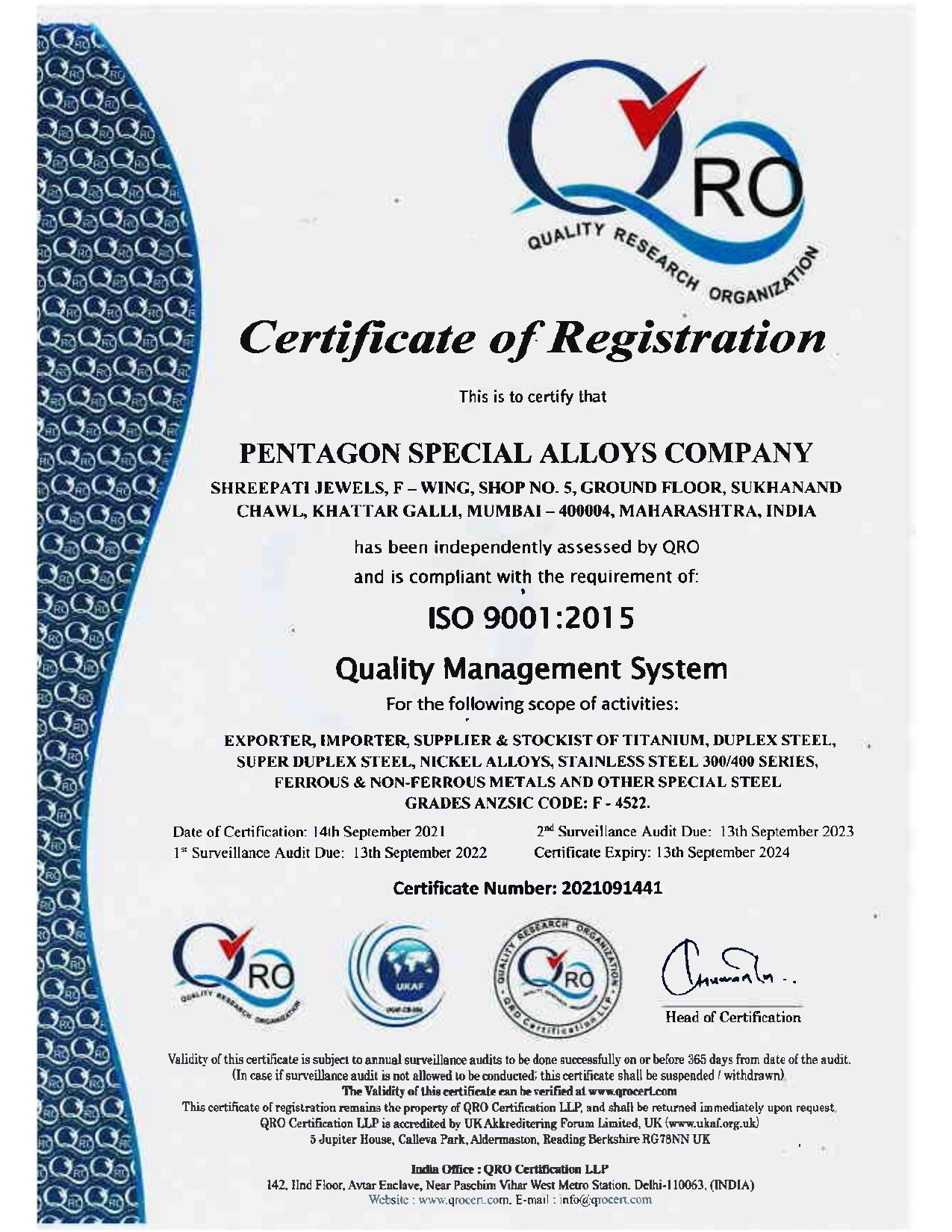 We at PENTAGON SPECIAL ALLOYS COMPANY , are committed to meet customers needs and expectations by delivering competitive services and solutions through continual improvement of our systems" that all of our activities are carried out in accordance with our business management system, which is working and maintaining quality as per 9001:2008, 14001:2004, OHSAS 18001:2007. The aim of our quality management system is to ensure that: